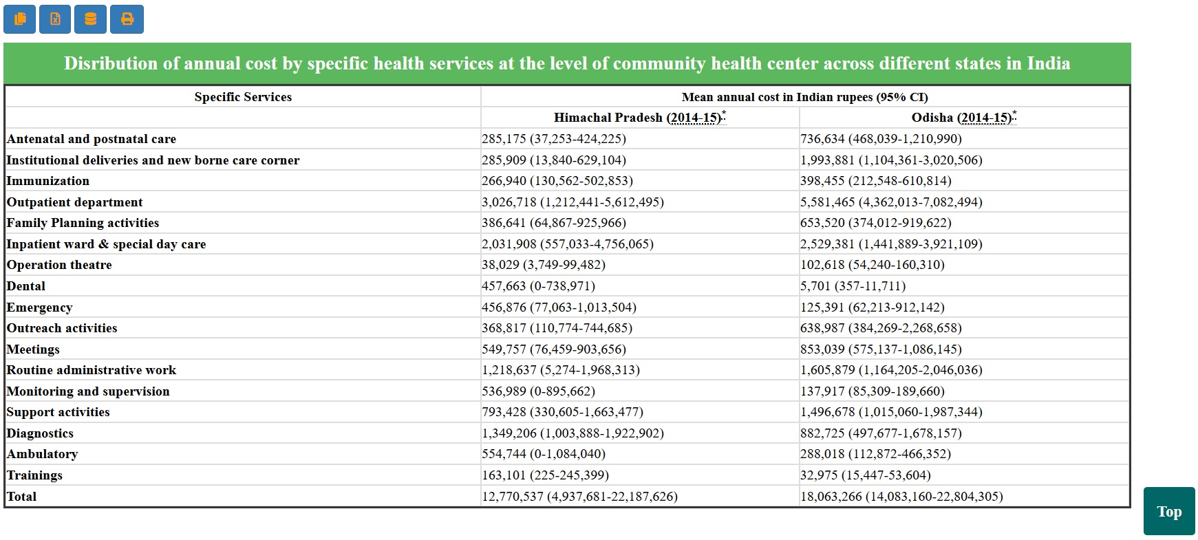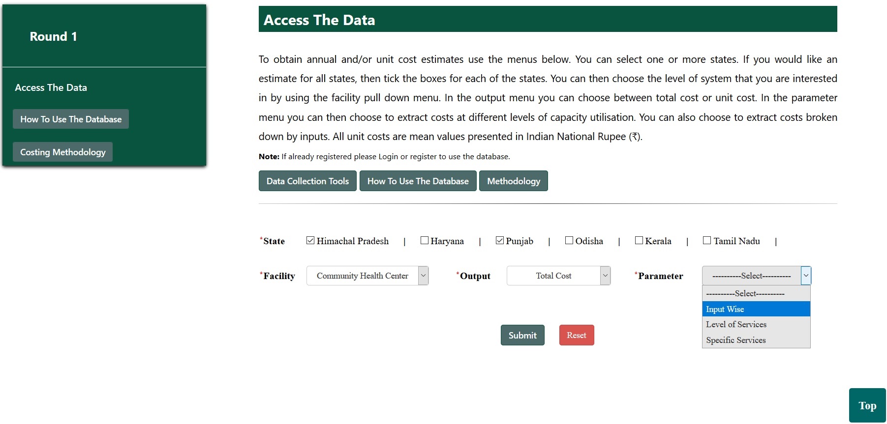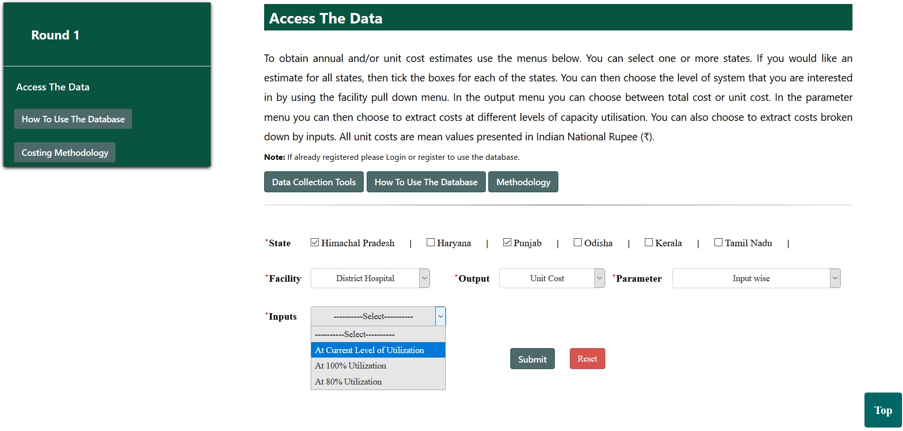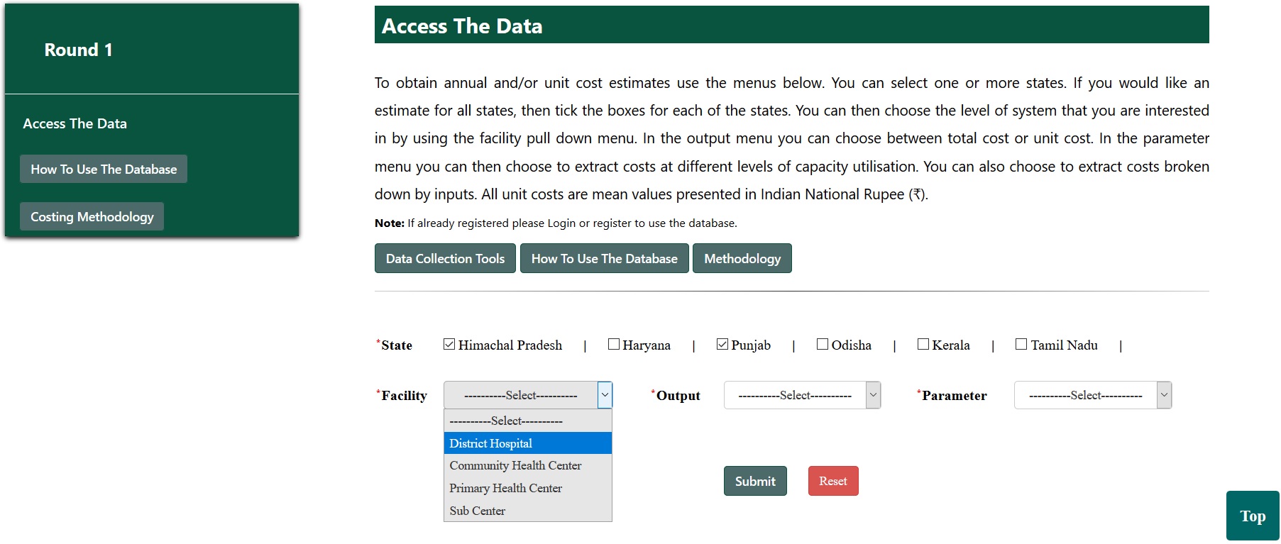 The Round 1 cost database provides economic cost data for district hospitals, community health centres, primary care centres and sub-health centres from 6 states (Himachal Pradesh, Haryana, Punjab, Odisha, Kerala and Tamil Nadu).