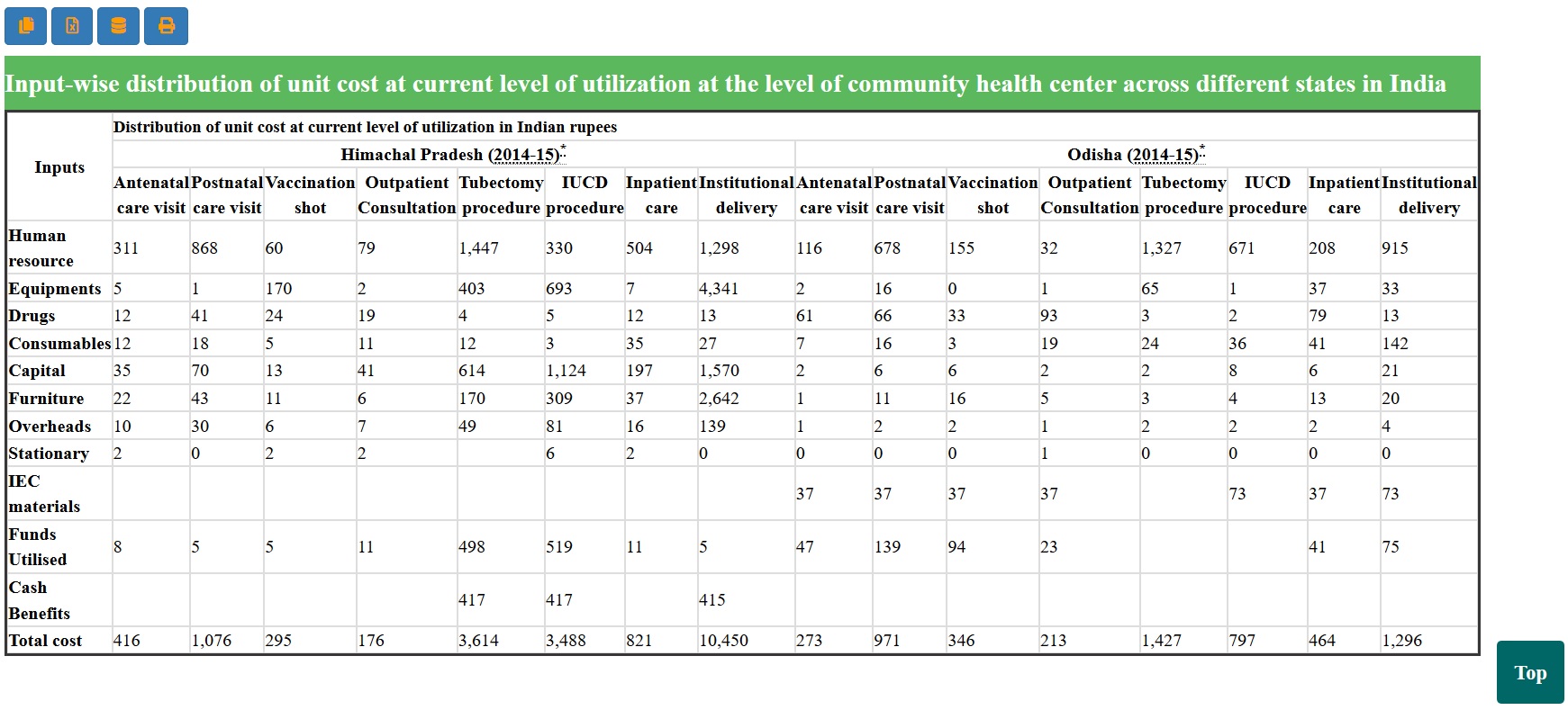 The screenshots below show the Unit Cost tables generated for Community Health Centres in Himachal Pradesh and Odisha at current levels of utilisation. Unit costs are presented for each service provided overall and/or broken down by input.
