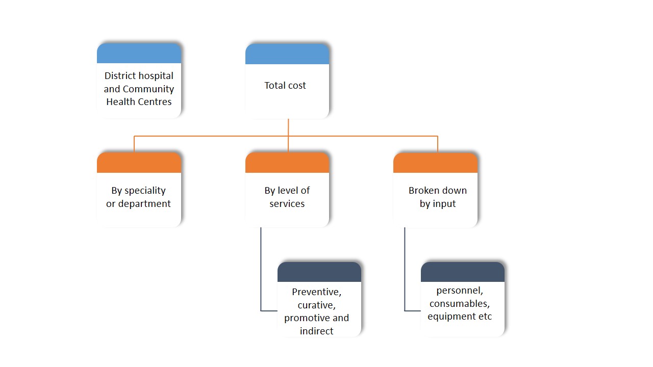 For each state and each facility level, it is possible to extract the mean annual cost of the facility (referred to as Total Cost) and costs per unit of output (referred to as Unit Cost) broken down inputs (personnel, consumables, equipment etc.), specialty or types of service and levels of service. The flowcharts below show the different breakdowns of data that can be accessed.