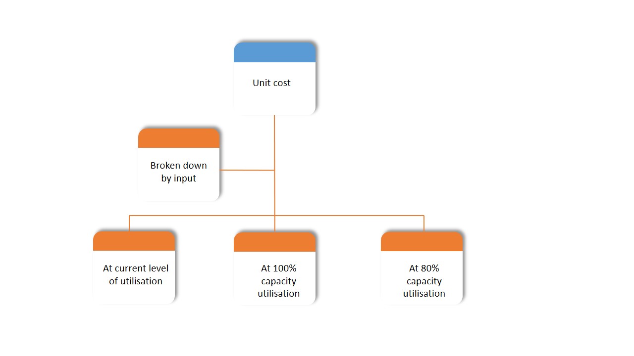 Costs are available for each service or specialty at a facility at the current levels of utilisation and with unit costs also available adjusted for different levels of capacity utilisation.